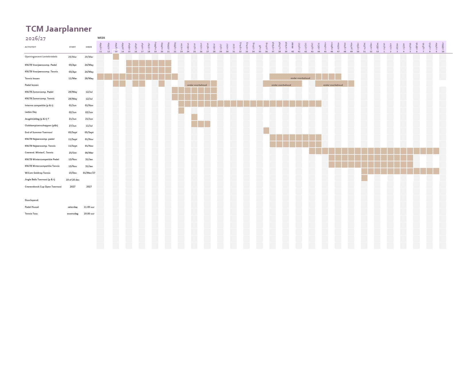 Bijgaand een overzicht van alle padel- en tennis activiteiten in 2026 van Tennis en Padelclub Maarheeze (wijzigingen voorbehouden).